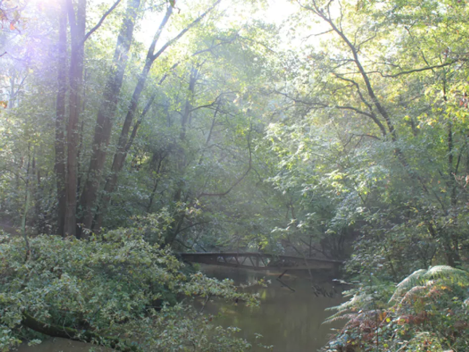 Je vervolgt je pad richting knooppunt 50 en duikt de natuur van het Leudal in. Via een tamelijk stijl trappenpad bereik je de Leubeek. Het bruggetje waarover je de beek oversteekt is (een deel van) een door de Schotse bevrijders in 1944 aangelegde baileybrug. De brug, die in originele staat niet van een leuning was voorzien, is gevormd door een van de sporen waarover (rups)voertuigen smalle stroompjes konden passeren.